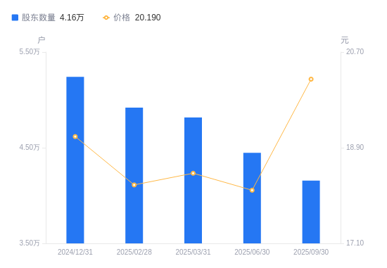 10月24日消息,数据显示,截至2025年9月30日,金徽酒A股股东总户数为4.16万户,较上期(2025年6月30日)减少2903户,降幅6.53%。公司最新A股总股本为5.07亿股,其中流通A股5.07亿股,户均持有流通A股数量为1.22万股,较上期增加796.82股,增幅6.98%;户均持流通A股市值24.64万元,较上期增加3.99万元,增幅19.34%。