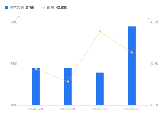 近一年(2024年9月30日至2025年9月30日),阿科力A股股东户数从7089户,增加至8766户,增幅23.66%,区间股价上涨21.96%。