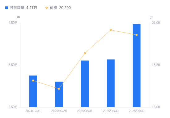 10月24日消息,数据显示,截至2025年9月30日,巨星农牧A股股东总户数为4.47万户,较上期(2025年6月30日)增加8394户,增幅23.11%。公司最新A股总股本为5.1亿股,其中流通A股5.1亿股,户均持有流通A股数量为1.14万股,较上期减少2636.65股,降幅18.77%;户均持流通A股市值23.15万元,较上期减少5.76万元,降幅19.92%。