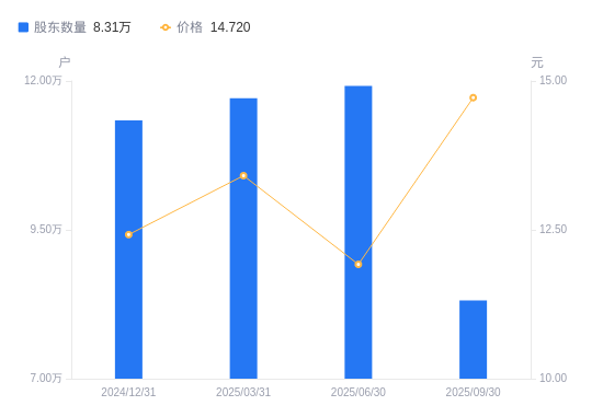 近一年(2024年9月30日至2025年9月30日),湖北宜化A股股东户数从10.48万户,减低至8.31万户,降幅20.68%,区间股价上涨13.41%。