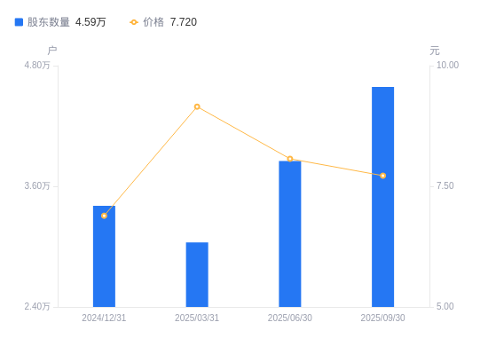 近一年(2024年9月30日至2025年9月30日),祥源文旅A股股东户数从4.64万户,减低至4.59万户,降幅1.05%,区间股价上涨41.91%。