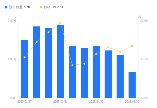 近一年(2024年9月30日至2025年9月30日),宏鑫科技A股股东户数从1.85万户,减低至9701户,降幅47.43%,区间股价上涨5.36%。