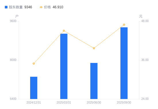 近一年(2024年9月30日至2025年9月30日),创耀科技A股股东户数从6914户,增加至9346户,增幅35.18%,区间股价上涨49.37%。