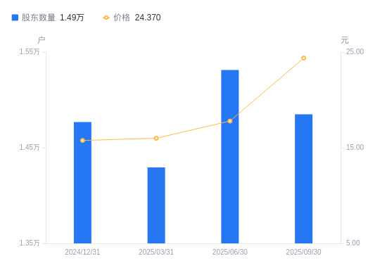 近一年(2024年9月30日至2025年9月30日),天振股份A股股东户数从1.76万户,减低至1.49万户,降幅15.70%,区间股价上涨73.58%。