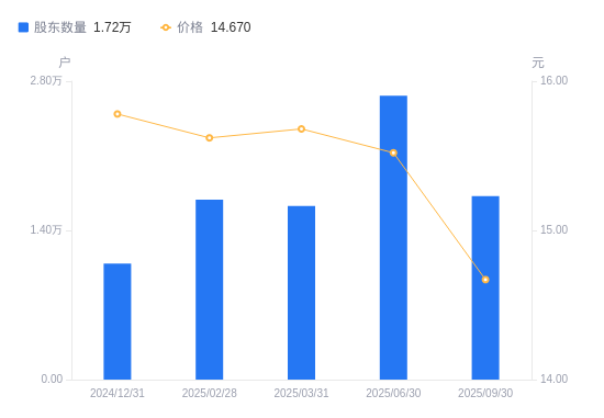 10月24日消息,数据显示,截至2025年9月30日,兴通股份A股股东总户数为1.72万户,较上期(2025年6月30日)减少9417户,降幅35.34%。公司最新A股总股本为3.25亿股,其中流通A股2.8亿股,户均持有流通A股数量为1.63万股,较上期增加5743.52股,增幅54.66%;户均持流通A股市值23.84万元,较上期增加7.53万元,增幅46.19%。
