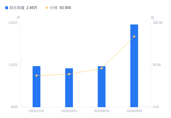 近一年(2024年9月30日至2025年9月30日),厦钨新能A股股东户数从1.38万户,增加至2.46万户,增幅78.85%,区间股价上涨232.53%。