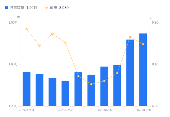 近一年(2024年9月30日至2025年9月30日),ST广物A股股东户数从2.52万户,减低至1.9万户,降幅24.72%,区间股价上涨66.60%。