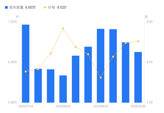 近一年(2024年10月20日至2025年10月20日),焦作万方A股股东户数从7.33万户,减低至6.6万户,降幅9.96%,区间股价上涨31.49%。