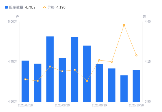 近一年(2024年10月31日至2025年10月20日),浙江交科A股股东户数从5.08万户,减低至4.7万户,降幅7.45%,区间股价上涨5.94%。