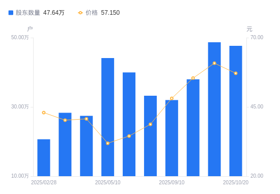 近一年(2024年11月20日至2025年10月20日),立讯精密A股股东户数从33.89万户,增加至47.64万户,增幅40.55%,区间股价上涨49.10%。