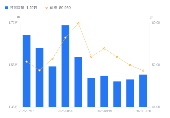 近一年(2024年12月10日至2025年10月20日),光庭信息A股股东户数从1.73万户,减低至1.49万户,降幅13.77%,区间股价下跌9.66%。