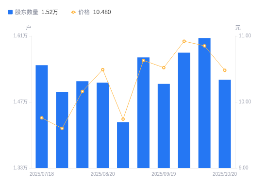 近一年(2024年11月8日至2025年10月20日),泰瑞机器A股股东户数从1.6万户,减低至1.52万户,降幅5.02%,区间股价上涨23.44%。