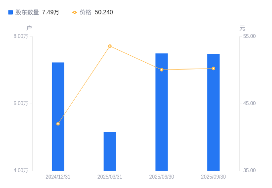 10月24日消息,数据显示,截至2025年9月30日,振华科技A股股东总户数为7.49万户,较上期(2025年6月30日)减少110户,降幅0.15%。公司最新A股总股本为5.54亿股,其中流通A股5.54亿股,户均持有流通A股数量为7402.74股,较上期增加10.86股,增幅0.15%;户均持流通A股市值37.19万元,较上期增加1950.22元,增幅0.53%。
