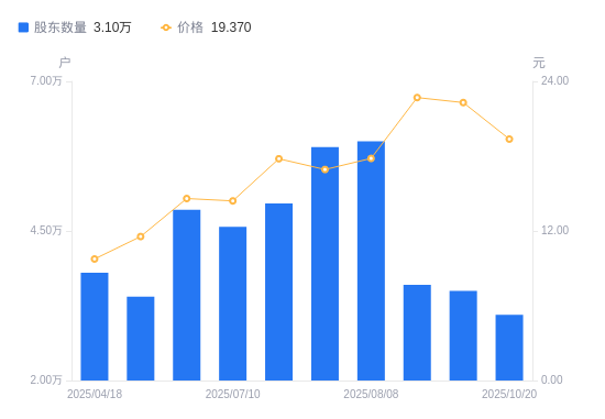近一年(2024年10月31日至2025年10月20日),北化股份A股股东户数从4.9万户,减低至3.1万户,降幅36.75%,区间股价上涨70.06%。