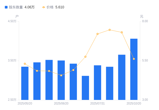 近一年(2024年11月20日至2025年10月20日),濮耐股份A股股东户数从3.72万户,增加至4.06万户,增幅9.08%,区间股价上涨38.48%。