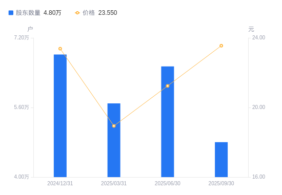 10月24日消息,数据显示,截至2025年9月30日,铭普光磁A股股东总户数为4.8万户,较上期(2025年6月30日)减少1.74万户,降幅26.59%。公司最新A股总股本为2.35亿股,其中流通A股1.78亿股,户均持有流通A股数量为3698.51股,较上期增加983.59股,增幅36.23%;户均持流通A股市值8.71万元,较上期增加2.94万元,增幅51.04%。