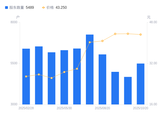 近一年(2024年12月31日至2025年10月20日),五洲医疗A股股东户数从6499户,减低至5489户,降幅15.54%,区间股价上涨68.95%。