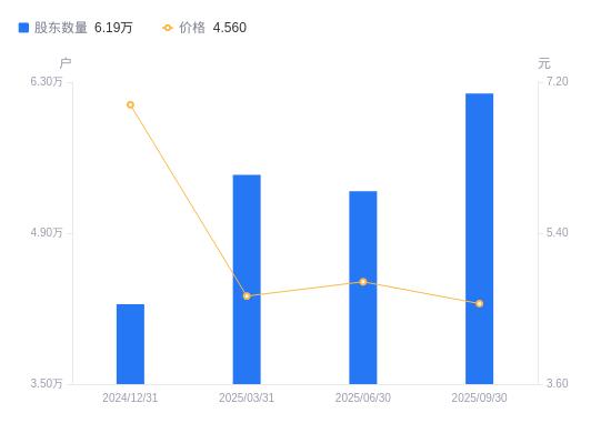 10月24日消息,数据显示,截至2025年9月30日,北京文化A股股东总户数为6.19万户,较上期(2025年6月30日)增加9048户,增幅17.11%。公司最新A股总股本为7.16亿股,其中流通A股7.15亿股,户均持有流通A股数量为1.16万股,较上期减少1976.52股,降幅14.61%;户均持流通A股市值5.27万元,较上期减少1.25万元,降幅19.22%。
