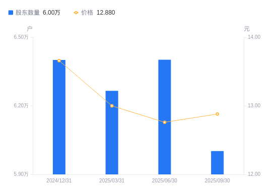 近一年(2024年9月30日至2025年9月30日),西安旅游A股股东户数从6.8万户,减低至6万户,降幅11.77%,区间股价下跌0.54%。