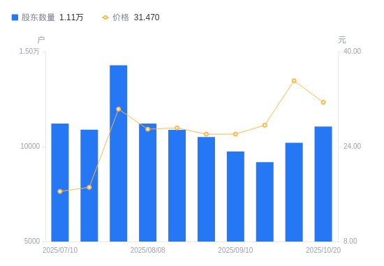 10月24日消息,数据显示,截至2025年9月30日,金春股份A股股东总户数为9653户,较上期(2025年9月19日)增加475户,增幅5.18%。公司最新A股总股本为1.2亿股,其中流通A股1.2亿股,户均持有流通A股数量为1.24万股,较上期减少643.37股,降幅4.92%;户均持流通A股市值36.13万元,较上期增加131.14元,增幅0.04%。