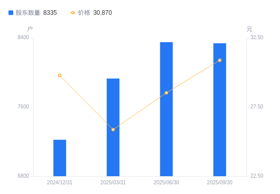 近一年(2024年9月30日至2025年9月30日),屹通新材A股股东户数从8874户,减低至8335户,降幅6.07%,区间股价上涨47.00%。