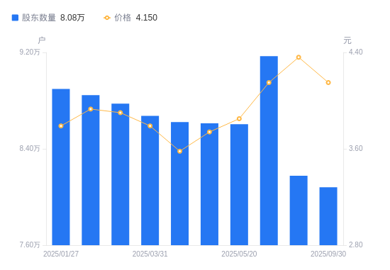 近一年(2024年9月30日至2025年9月30日),泰达股份A股股东户数从9.26万户,减低至8.08万户,降幅12.69%,区间股价上涨14.96%。