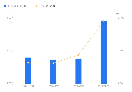 近一年(2024年9月30日至2025年9月30日),硕贝德A股股东户数从5.84万户,增加至8.8万户,增幅50.59%,区间股价上涨118.40%。