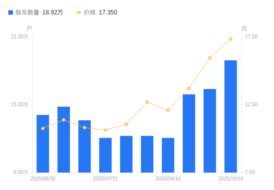 近一年(2024年9月30日至2025年9月30日),北方铜业A股股东户数从9.81万户,增加至16.39万户,增幅67.16%,区间股价上涨68.89%。