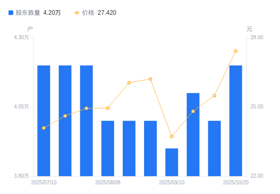 近一年(2024年10月31日至2025年10月20日),科大国创A股股东户数从5.66万户,减低至4.2万户,降幅25.78%,区间股价上涨7.57%。