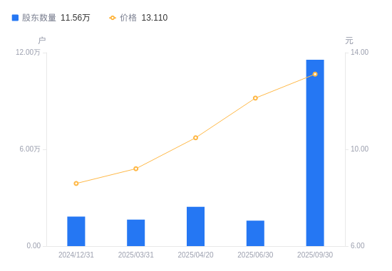 10月24日消息,数据显示,截至2025年9月30日,晨光生物A股股东总户数为11.56万户,较上期(2025年6月30日)增加9.98万户,增幅632.18%。公司最新A股总股本为4.83亿股,其中流通A股3.98亿股,户均持有流通A股数量为3445.05股,较上期减少2.18万股,降幅86.34%;户均持流通A股市值4.52万元,较上期减少26.06万元,降幅85.23%。