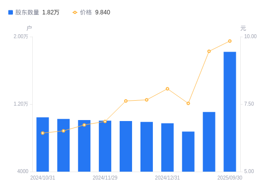 近一年(2024年9月30日至2025年9月30日),世龙实业A股股东户数从1.13万户,增加至1.82万户,增幅60.67%,区间股价上涨72.93%。