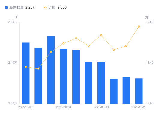 近一年(2024年11月20日至2025年10月20日),清水源A股股东户数从2.63万户,减低至2.25万户,降幅14.49%,区间股价下跌4.74%。