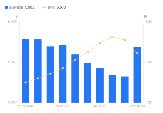 近一年(2024年9月30日至2025年9月30日),江苏金租A股股东户数从6.76万户,减低至5.9万户,降幅12.63%,区间股价上涨20.64%。