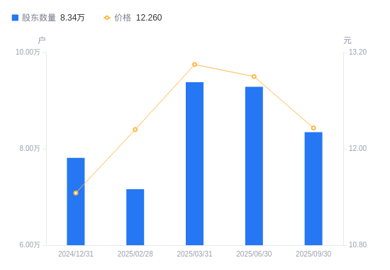10月26日消息,数据显示,截至2025年9月30日,美利云A股股东总户数为8.34万户,较上期(2025年6月30日)减少9408户,降幅10.13%。公司最新A股总股本为6.95亿股,其中流通A股6.95亿股,户均持有流通A股数量为8331.59股,较上期增加844.13股,增幅11.27%;户均持流通A股市值10.21万元,较上期增加5557.09元,增幅5.75%。
