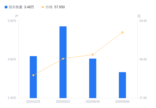 近一年(2024年9月30日至2025年9月30日),奥普光电A股股东户数从3.88万户,减低至3.48万户,降幅10.41%,区间股价上涨100.10%。