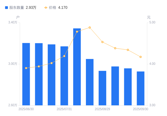 近一年(2024年9月30日至2025年9月30日),融捷健康A股股东户数从3.28万户,减低至2.93万户,降幅10.68%,区间股价上涨48.93%。