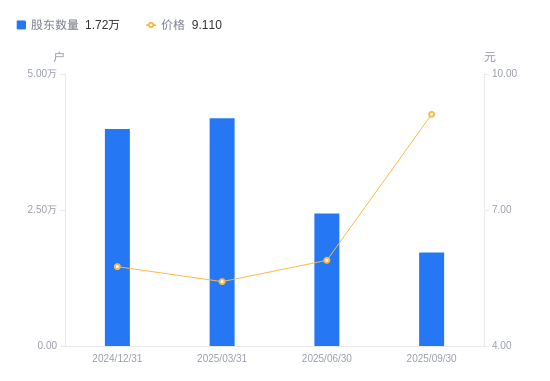 近一年(2024年9月30日至2025年9月30日),*ST金比A股股东户数从3.85万户,减低至1.72万户,降幅55.33%,区间股价上涨41.68%。