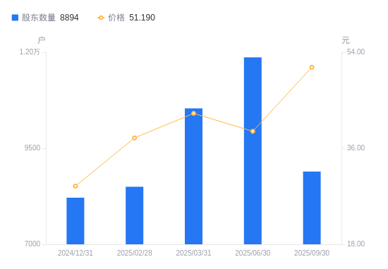 近一年(2024年9月30日至2025年9月30日),珠城科技A股股东户数从8949户,减低至8894户,降幅0.61%,区间股价上涨100.19%。