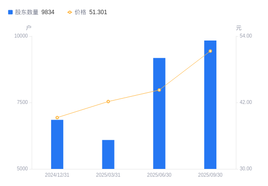 近一年(2024年9月30日至2025年9月30日),新莱福A股股东户数从8357户,增加至9834户,增幅17.67%,区间股价上涨72.98%。