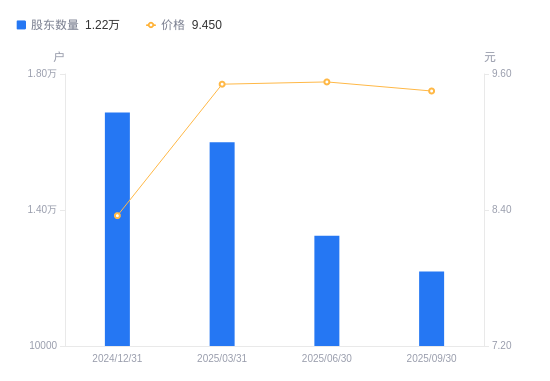 近一年(2024年9月30日至2025年9月30日),*ST生物A股股东户数从2.01万户,减低至1.22万户,降幅39.28%,区间股价上涨20.38%。