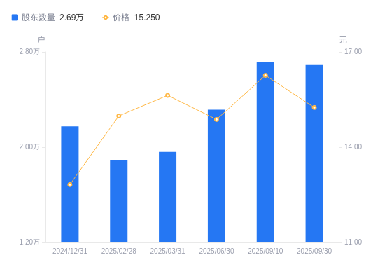 近一年(2024年9月30日至2025年9月30日),万泽股份A股股东户数从2.08万户,增加至2.69万户,增幅29.57%,区间股价上涨47.59%。