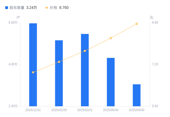 近一年(2024年9月30日至2025年9月30日),三维化学A股股东户数从3.49万户,减低至3.24万户,降幅7.07%,区间股价上涨78.05%。