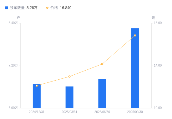近一年(2024年9月30日至2025年9月30日),正海磁材A股股东户数从5.02万户,增加至8.26万户,增幅64.56%,区间股价上涨82.03%。