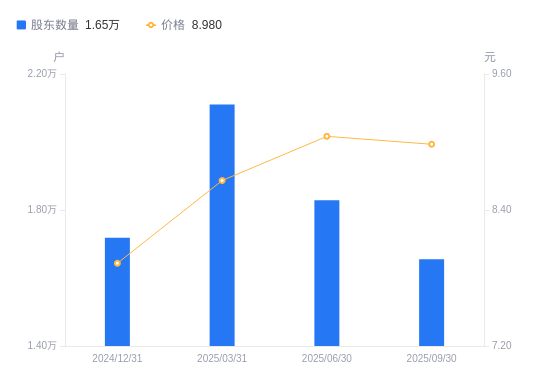 近一年(2024年9月30日至2025年9月30日),富邦科技A股股东户数从1.63万户,增加至1.65万户,增幅1.25%,区间股价上涨29.02%。