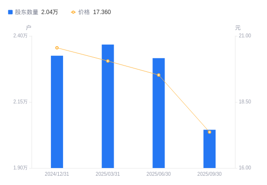 10月26日消息,数据显示,截至2025年9月30日,贝仕达克A股股东总户数为2.04万户,较上期(2025年6月30日)减少2713户,降幅11.71%。公司最新A股总股本为3.12亿股,其中流通A股2.89亿股,户均持有流通A股数量为1.41万股,较上期增加1655.59股,增幅13.27%;户均持流通A股市值24.54万元,较上期增加1789.33元,增幅0.73%。