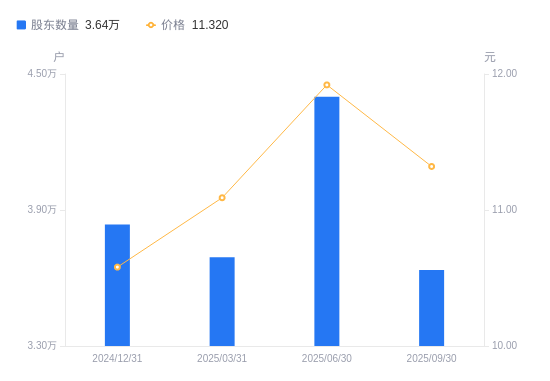 10月26日消息,数据显示,截至2025年9月30日,永顺泰A股股东总户数为3.64万户,较上期(2025年6月30日)减少7647户,降幅17.38%。公司最新A股总股本为5.02亿股,其中流通A股2.36亿股,户均持有流通A股数量为6490.47股,较上期增加1127.99股,增幅21.03%;户均持流通A股市值7.35万元,较上期增加9551.34元,增幅14.94%。