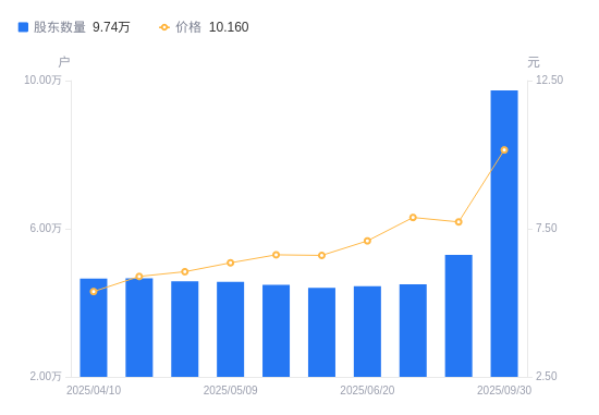 近一年(2024年9月30日至2025年9月30日),特发信息A股股东户数从6.27万户,增加至9.74万户,增幅55.36%,区间股价上涨129.35%。