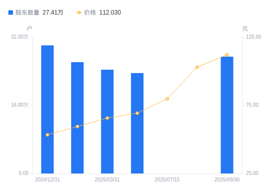 近一年(2024年12月31日至2025年9月30日),药明康德A股股东户数从30.05万户,减低至27.41万户,降幅8.81%,区间股价上涨105.86%。