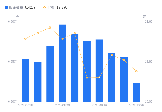 近一年(2024年10月31日至2025年10月20日),航发控制A股股东户数从5.39万户,增加至6.42万户,增幅19.12%,区间股价下跌19.28%。