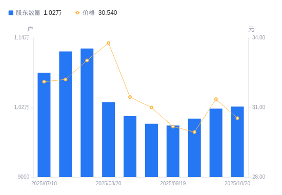 近一年(2024年10月31日至2025年10月20日),争光股份A股股东户数从1.13万户,减低至1.02万户,降幅9.48%,区间股价上涨25.78%。